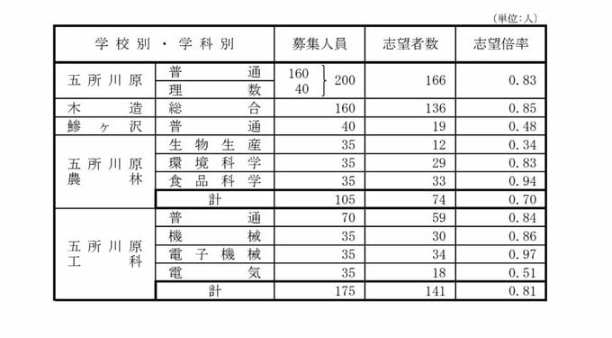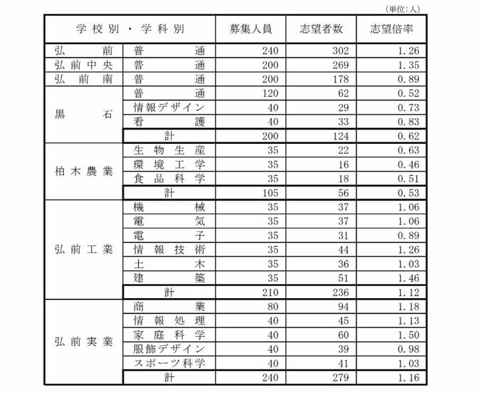 青森県立高校入試2026 志望倍率 青森高校1.25倍、弘前高校1.26倍、八戸高校1.22倍など 最も高いのは弘前実業1.50倍 全日制0.92倍【全校掲載・学校別倍率一覧】(進路志望状況 第2次調査結果) 青森テレビ 2026年1月8日(木) 17:00 国内 ♦記事を最初から読む