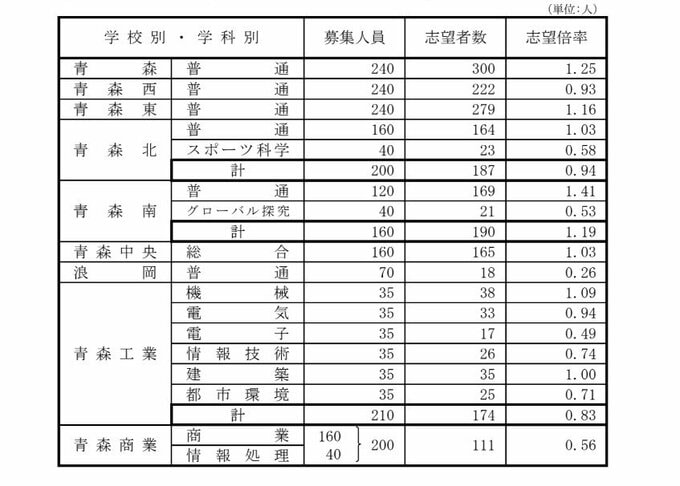 青森県立高校入試2026 志望倍率 青森高校1.25倍、弘前高校1.26倍、八戸高校1.22倍など 最も高いのは弘前実業1.50倍 全日制0.92倍【全校掲載・学校別倍率一覧】(進路志望状況 第2次調査結果) 青森テレビ 2026年1月8日(木) 17:00 国内 ♦記事を最初から読む ♦この記事の画像をもっと見る