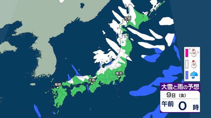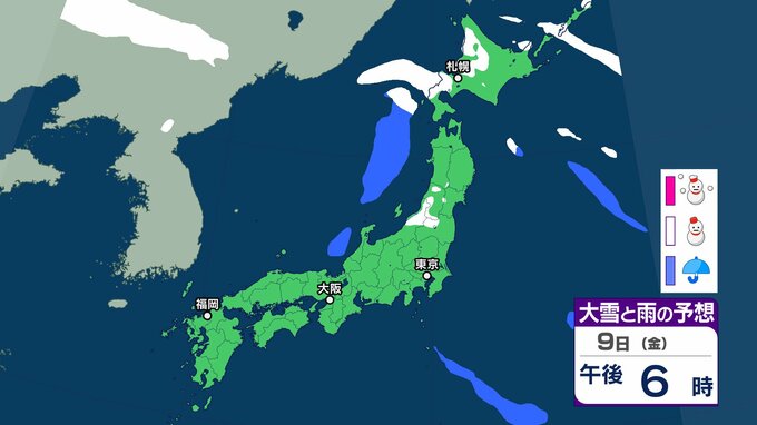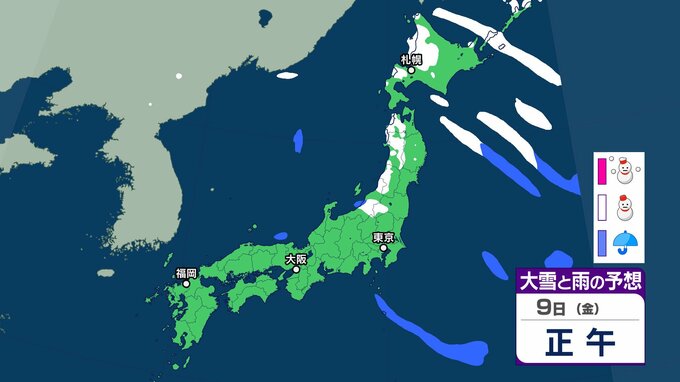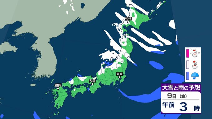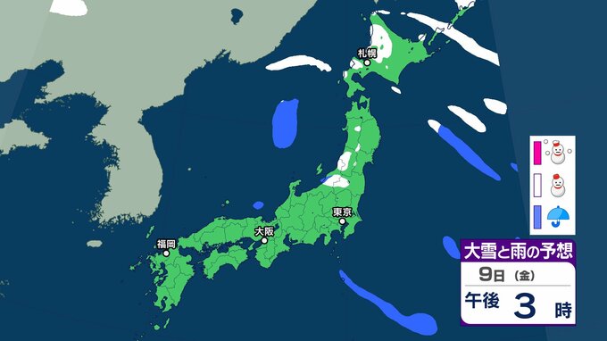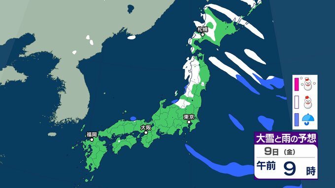気象庁によりますと、9日は北日本を中心に気圧の傾きが大きく、南西諸島と北日本は気圧の谷の影響を受けます。全国的に9日にかけて強風や風雪、高波に注意が必要だということです。東日本では9日にかけて、大雪による交通障害に警戒、着雪やなだれに注意が必要だとしています。
