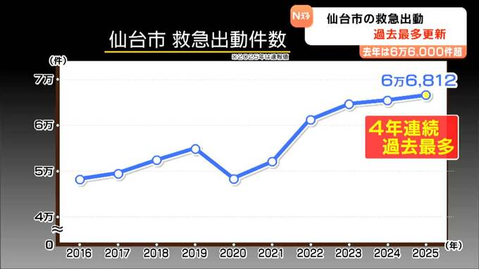 仙台市では2025年、救急出動の件数が6万6000件を超え、4年連続で過去最多を更新しました。
