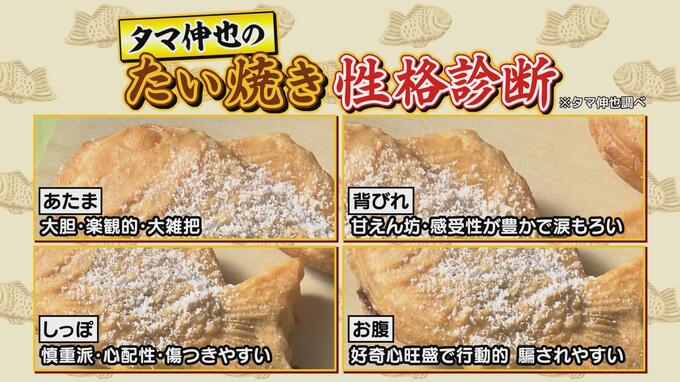 ここで『どこから食べる?タマ伸也のたい焼き性格診断!(タマ伸也調べ)』皆さんも普段の食べ方を想像しながらお楽しみください。