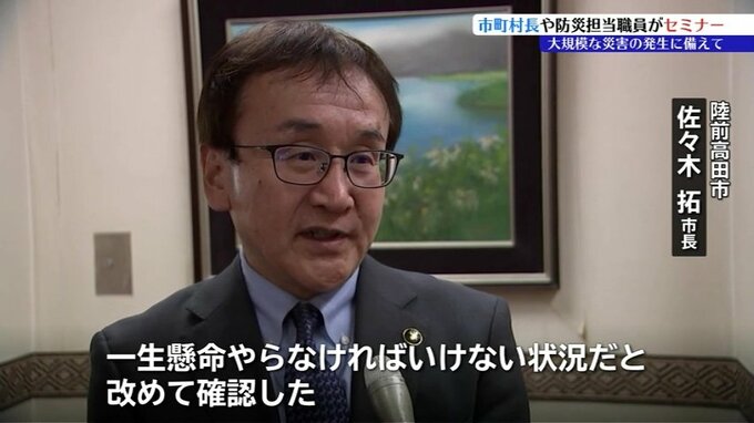 大規模な災害が発生した際に、迅速かつ的確な判断が求められる市町村長や、自治体の防災担当職員がいざという時の対応について学ぶセミナーが盛岡市で開かれました。