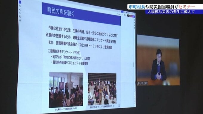 セミナーでは、2024年1月の能登半島地震で被災した石川県志賀町の稲岡健太郎町長がオンラインで講演し、就任まもなく発生した大災害で状況の把握に苦労したエピソードなどを披露。
