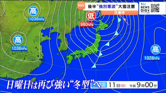 このため、日曜日は夜にかけて「強烈な寒波」が流れ込み、日本海側を中心に大雪となるおそれがあります。