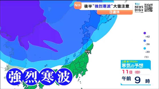 10日から成人の日の月曜日にかけては3連休という人も多いと思います。宮城県内では日曜日、「はたちの集い」が行われる所も多く、気になるのが天気。10日は一旦寒さが緩みますが、日曜から月曜にかけては、「強烈な寒波」がやってくる見込みで、西部では大雪に注意が必要です。