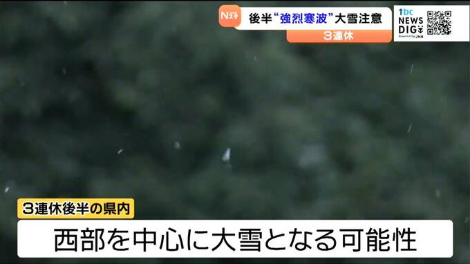 太平洋側も雪の降る所が多く、3連休後半の県内は、西部を中心に大雪となる可能性があります。今後の情報に注意してください。