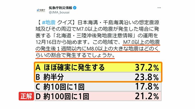 気象庁は16日から新たに「北海道・三陸沖後発地震注意情報」の運用を始めましたが、住民に情報の名前や内容が十分に浸透していないため、早くも大きな課題が浮かび上がっています。北海道から岩手県にかけての太平…
