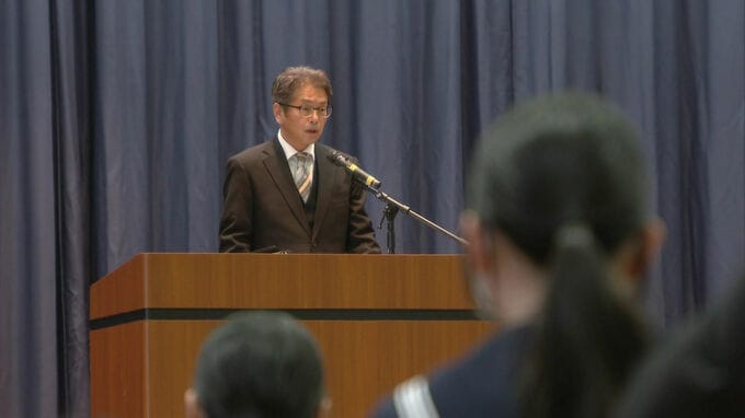 梅木陽一校長は「自分の可能性を信じて仲間を大切にしながら前向きに歩んでいきましょう」と話しました。