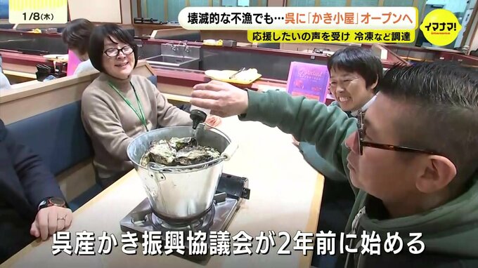 このカキ小屋は、特産品「カキ」を観光客に楽しんでもらおうと、呉産かき振興協議会が2年前から始めました。今シーズンは呉地域などで養殖カキが大量に死ぬなどして壊滅的な不漁となり、開店が危ぶまれていました。