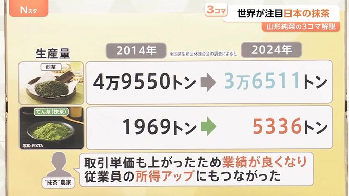 生産量で見ると、現状まだ煎茶の方が多いですが、10年前と比べると、「煎茶」は1万トン以上減少しており、一方で「てん茶(抹茶)」は増加しています。