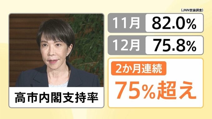 支持率を見ていきますと、11月が82%、12月は75.8%と2か月連続で75%を超えて、高い支持率のロケットスタートを切っています(JNN世論調査)。