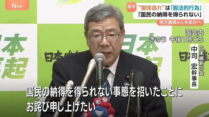 日本維新の会の地方議員が、一般社団法人の理事に就任することで国民健康保険料の支払いを逃れていたとされる問題。党は、関与した議員4人を処分する方針です。
