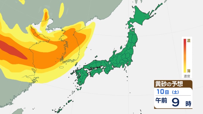 【黄砂情報】1月なのに「黄砂」飛来予想 10日(土)から九州・中四国・近畿や北日本にも到達か 黄砂シミュレーション 長崎放送 2026年1月9日(金) 13:00 国内 10日午前から飛来か ◆黄砂シミュレーション 飛来予測によりますと、黄砂は1月10日(土)午前に朝鮮半島を通過し、九州北部で飛来が始まる見込みです。