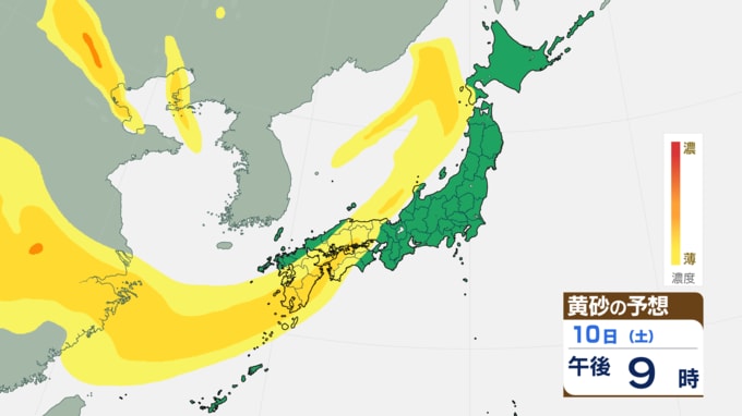 【黄砂情報】1月なのに「黄砂」飛来予想 10日(土)から九州・中四国・近畿や北日本にも到達か 黄砂シミュレーション 長崎放送 2026年1月9日(金) 13:00 国内 中四国・近畿・北陸などにも拡大へ ◆黄砂シミュレーション さらに10日午後には中国・四国地方まで広がり、11日(日)朝にかけて近畿や北陸、東海地方、さらに北海道の一部にまで到達する見込みです。 洗濯物や車への付着のほか健康管理などに注意してください。