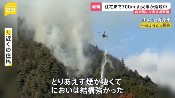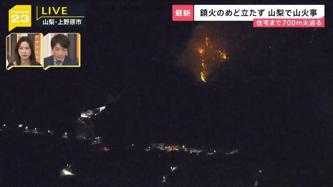 現場は、中央道上り線・談合坂サービスエリアから2キロほど西にある山。燃えている場所と住宅との距離は、最も近いところで、少なくとも700メートルだということです。上野原市では、今月1日から現在まで、林野火災注意報が出されていました。