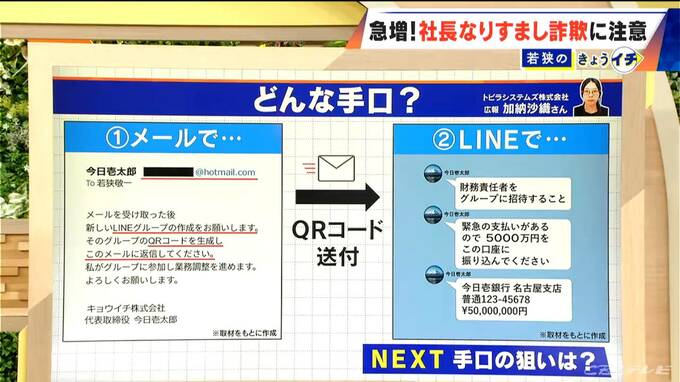 詐欺犯が社長名で入り込んできます。「財務責任者をグループに招待すること」「緊急の支払いがあるので5000万円をこの口座に振り込んでください」ということで、記載された口座番号に振り込んでしまう。ということなんです。