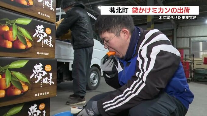 熊本県苓北町で、木に実らせたまま完熟させた袋かけミカンの出荷が始まりました。