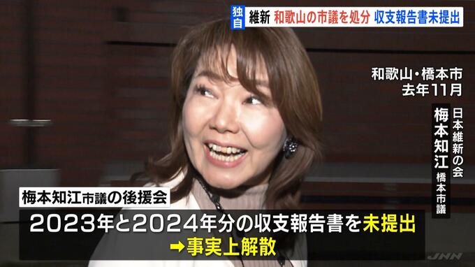 地方議員などの政治団体が政治資金収支報告書を2年続けて提出せず、解散させられていた問題で、日本維新の会は、所属する和歌山県の市議会議員を4か月の党員資格停止処分としていたことが分かりました。 国会議…