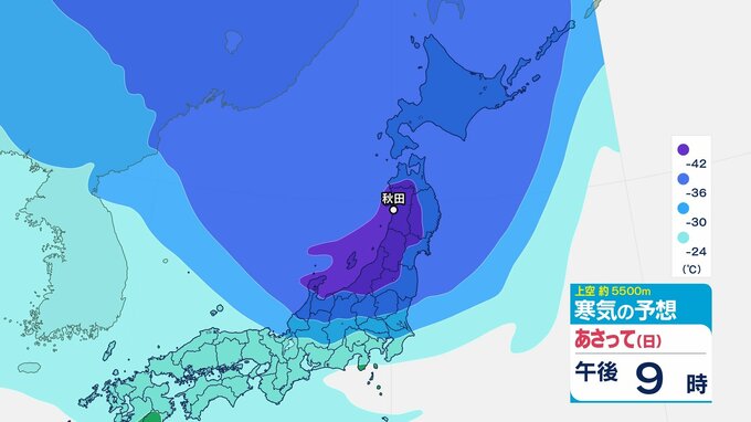 11日(日)夜の北日本の寒気は、秋田の5500メートル上空で氷点下42℃以下が予想されており、秋田の高層観測(午後9時)で氷点下40度を下回ったのは今季はまだ1月2日の1回(氷点下40.4℃)だけで、今回は「今季最強」の寒気となります。
