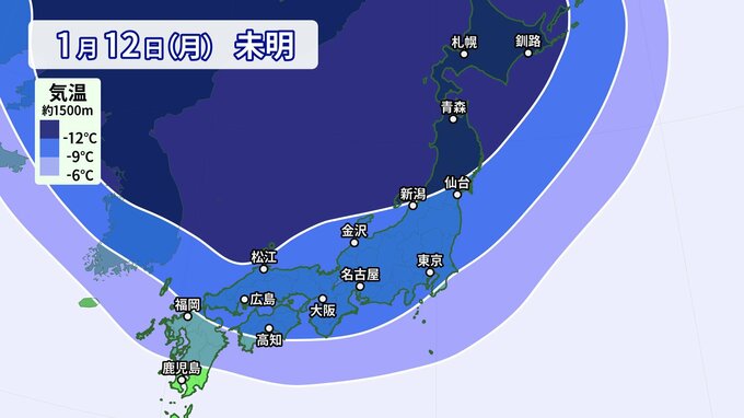 上空には、-6℃以下の平地でも、雨ではなく”雪”の目安になる寒気が流れ込むほか、‐9℃や‐12℃以下という、大雪のおそれがある強烈な寒気が入る見込みです。