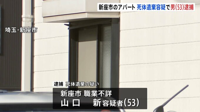 きょう午前、埼玉県新座市のアパートの一室で1人の遺体が見つかり、この部屋に住む53歳の男が逮捕されました。新座市の職業不詳・山口新容疑者(53)は今月、自宅アパートに性別不明の1人の遺体を遺棄した疑いが持…