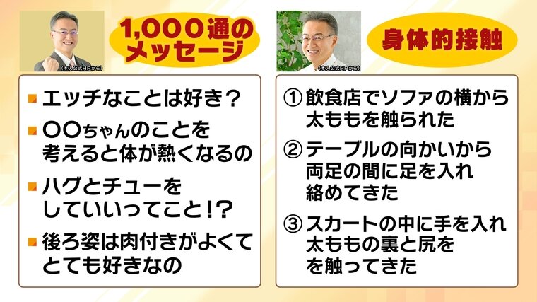 さらに報告書では、「太ももを触ってきた」「足を絡めてきた」などの“痴漢行為”も3件確認されたとして、ストーカー規制法や不同意わいせつ罪に抵触する可能性も否定できないと指摘しています。