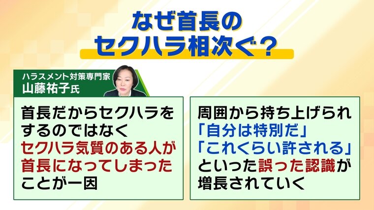 山藤氏は、「首長だからセクハラをする」のではなく「セクハラ気質のある人が首長になってしまった」ことが一因だと指摘。周囲から持ち上げられ、「自分は特別だ」「これくらい許される」といった誤った認識が増長されていくと分析しています。