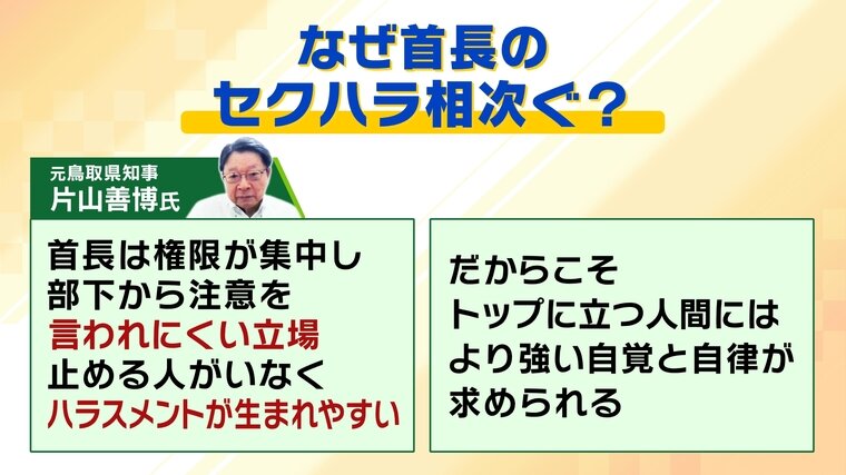 また、片山氏は知事経験者の立場から、「首長は権限が集中し、部下から注意を言われにくい立場」であり、「止める人がおらずハラスメントが生まれやすい」。「だからこそ、トップに立つ人間にはより強い自覚と自律が求められる」と言います。
