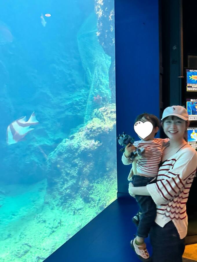 また、美ら海水族館でも、子どもとお揃いコーデ。紅白のボーダー柄の服を着用し、「センネンダイという紅白の魚ともリンクしてて縁起良い感じ 笑」と、笑顔の新井さんと3ショットの画像を添えました。