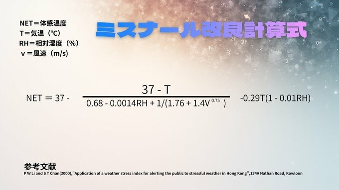 体感温度を正確に求めるには、【気温】、【風の強さ】、【湿度】が関係していて、「ミスナール改良計算式」という専門的な計算式ではじき出されます。(式は画像で掲載します)