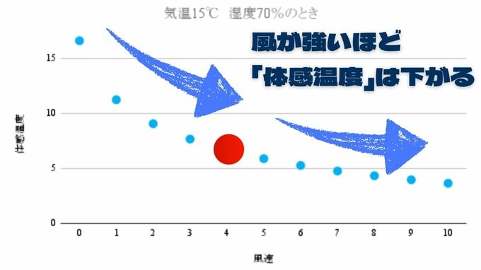 仮に、気温15℃、湿度70%の状況で、風速が4メートルあると、体感温度は約10℃も低下するのです。