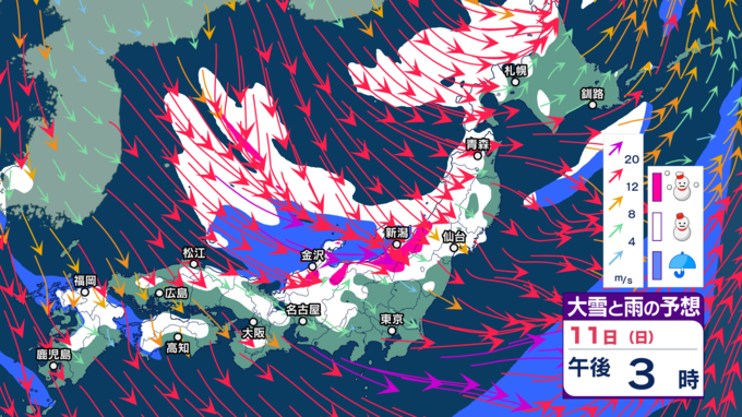 北日本~西日本の日本海側を中心には大雪となる所があると予想されており、11日6時~12日6時までに予想される24時間降雪量は、多い所で東北…100cm、北陸・東海・近畿…70cm、北海道・関東甲信・中国…50cm、四国…20cmとなっています。