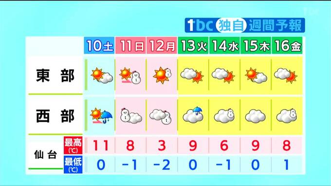 最低気温は、9日の朝より高い所が多いですが、氷点下の所が多いでしょう。路面や水道管の凍結に注意してください。最高気温は10℃以上の所が多く、3月中旬から下旬並みの見込みです。