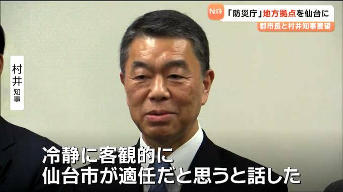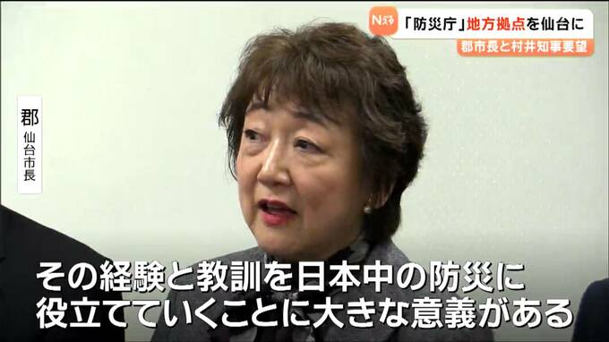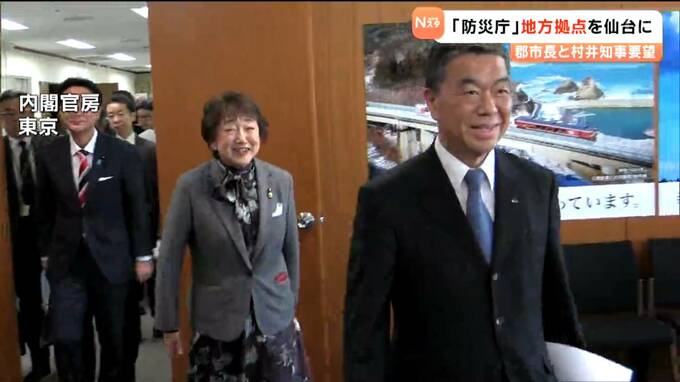 郡市長と村井知事は内閣官房を訪れ、牧野京夫防災庁設置準備担当大臣に要望書を手渡しました。要望書では、防災庁の地方拠点を仙台市にするよう求めていて、東日本大震災での災害対応や復旧・復興事業を通して培った知見のほか、首都圏へのアクセスの良さなど地方拠点として適した環境が整っていることをアピールしています。