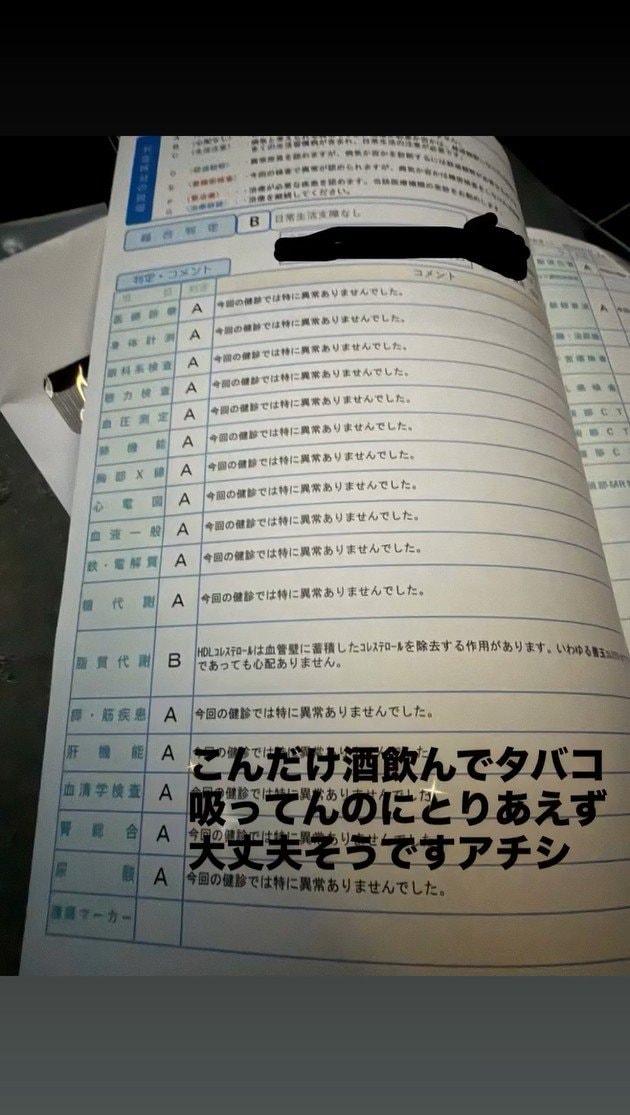 現在40歳の赤西さんは、健康診断の結果が印刷された用紙の接写を投稿。一番上の「医師診察」から始まって「身体計測・眼科系検査・聴力検査・血圧測定・肺機能・胸部X線・心電図・血液一般・鉄・電解質・糖代謝」「膵・筋疾患・肝機能・血清学検査・腎総合」まで、ズラリと「A」「特に異常ありませんでした」が並んでいます。