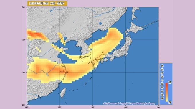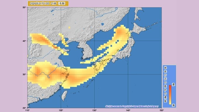 9日午後時点の予想では、黄砂は10日夜から西日本を中心に各地にかかり始めます。