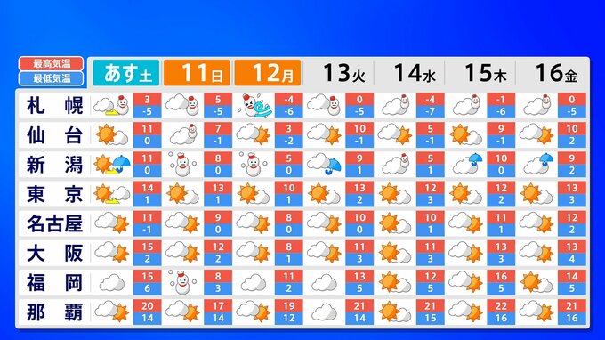気象庁によると、10日は朝鮮半島付近の低気圧が急速に発達しながら日本海北部に進む見込みです。その後11日から12日頃にかけて、日本付近は強い冬型の気圧配置となり強い寒気が流れ込むでしょう。
