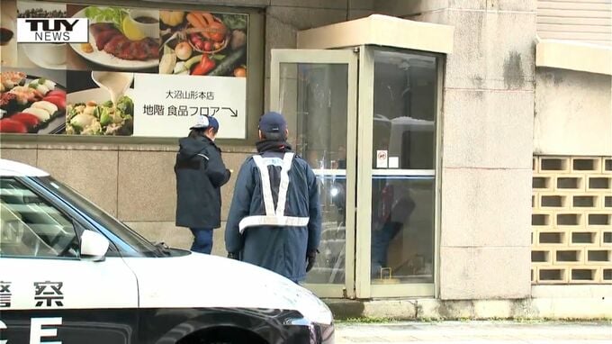大塚美咲アナウンサー「山形市の旧大沼デパートです。あちらのガラス扉が大きく割れていて、何者かが侵入したあとがあるということで、現在、警察による鑑識作業が行われています」