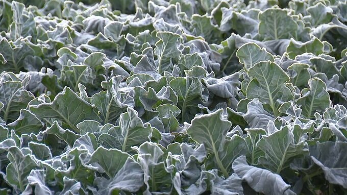 野菜の葉は霜で覆われています。