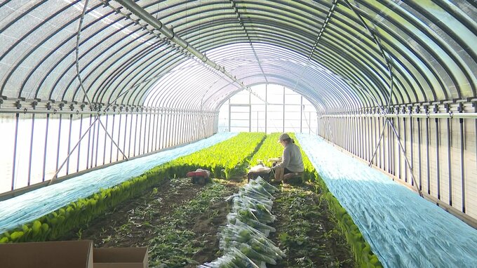 「小松菜もちょっと凍っていた感じで、収穫も早い時間からはできないので、ちょっとずらしてきょうは始めました。対策は青い不織布なんですけど、これで温度を保って少しでも成長を早めるという形ですね」