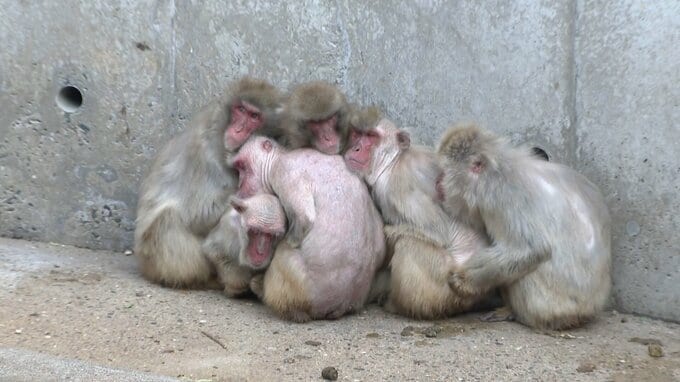 福岡市動物園のニホンザルは、体を寄せ合い寒さをしのぐ「サル団子」をつくっていました。