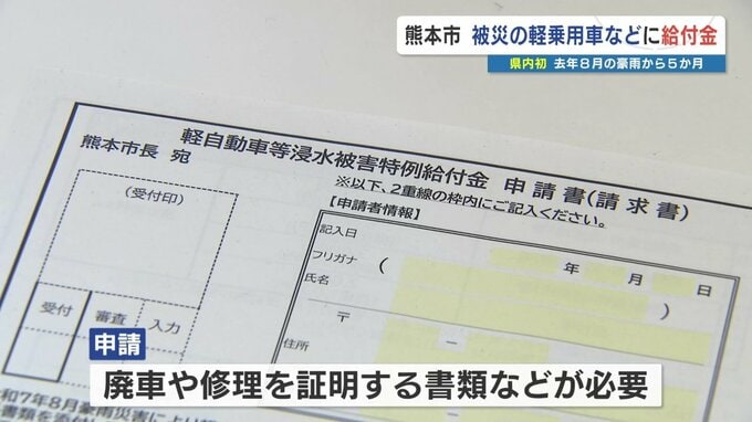 去年8月の記録的な大雨から今週末で5か月を迎えますが、熊本市は、軽乗用車やバイクなどが被災した人への給付金の受け付けを始めました。