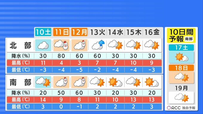 【1/10・11・12(土日月)広島天気】日曜と月曜は大雪のおそれ 3連休・成人の日は冬用タイヤ必須 中国放送 2026年1月9日(金) 18:09 国内 天気 この先の10日間予想 11日(日)から12日(月)は大雪になる見込みです。雪道のノーマルタイヤでの走行は控えてください。火曜以降は寒気がゆるむため、降れば雨中心になる予想です。来週の後半は、だんだんと日差しが復活し、暖かさも感じられそうです。