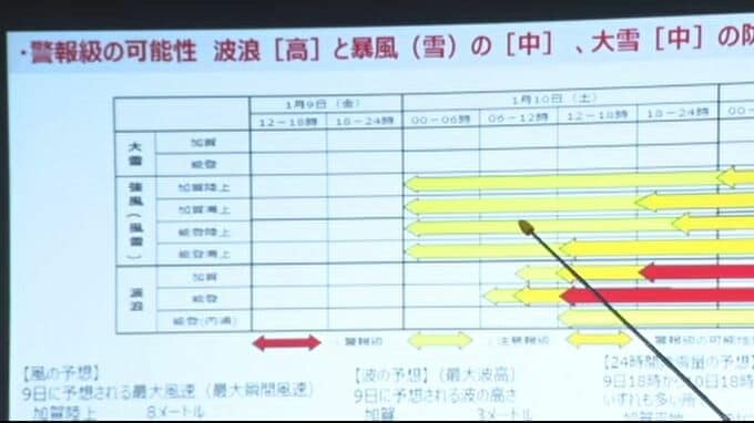 金沢地方気象台によりますと、10日になると大陸から強い寒気が入り始め、11日には強い冬型の気圧配置となる見込みで、石川県内は雪や風が強まり、平地でも警報級の大雪となるおそれがあります。