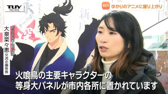 新庄市商工観光課 大泉菜々恵 交流企画係長「この松永源吾の主人公のパネルもそうだが、火喰鳥の主要キャラクターの等身大のパネルが市内各所に置かれています」