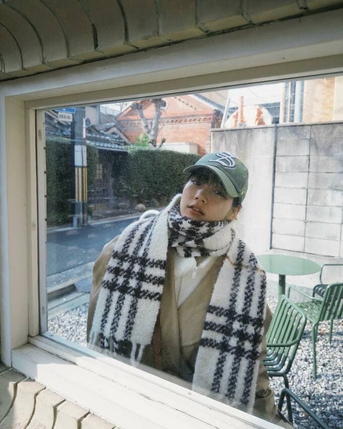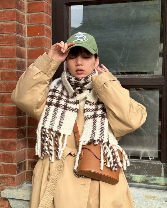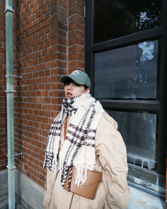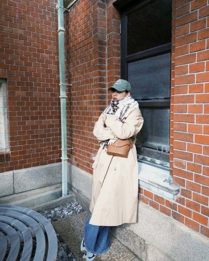 のんさんは、ベージュのトレンチコートをまとい、白いニットのトップスに、青いデニムを着用。白地に黒のチェック柄のマフラーに、ステラマッカートニーのロゴの入った緑色のベースボールキャップをコーディネートして、公園を散策する様子が映し出されています。