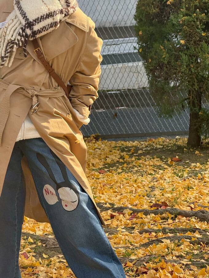 デニムのジーンズは、以前のんさんがモデルを務めたこともある「ステラ マッカートニー」と、現代美術家・奈良美智さんがコラボレーションしたアイテム。特徴的なイラストの刺繍が施され、コーディネートのアクセントになっています。
