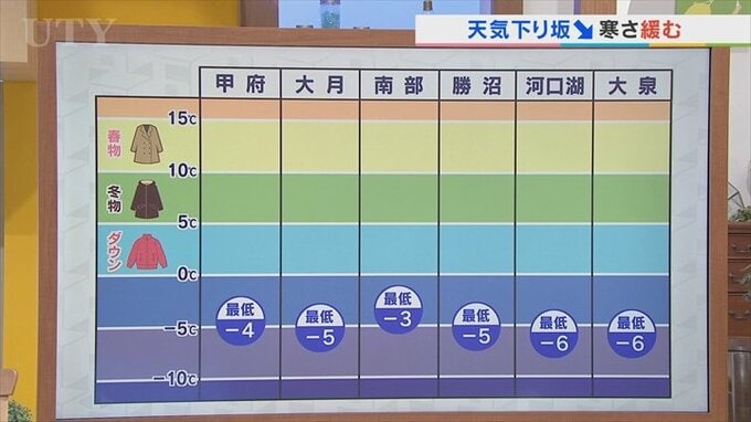 あすの気温をを見ていきますと、朝の最低気温は今朝と比べて2℃ほど高くなります。それでも甲府や大月、勝沼、河口湖、大泉は-4℃を下回ります。水道管の凍結のリスクがありますので、あすも油断できない状況となります。