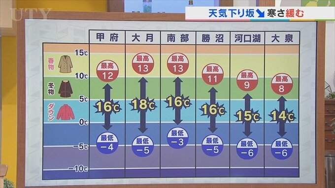 大月は18℃の気温差、甲府、南部、勝沼では16℃と5℃につき着るもの1枚分変わってきますので、くれぐれも脱ぎ着しやすい服装でお過ごしください。