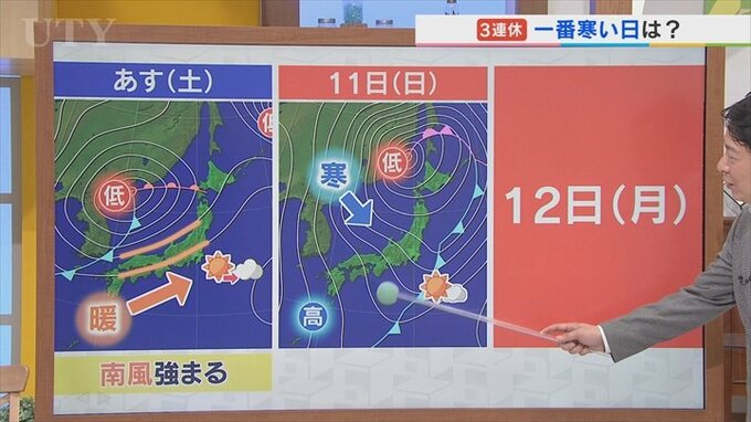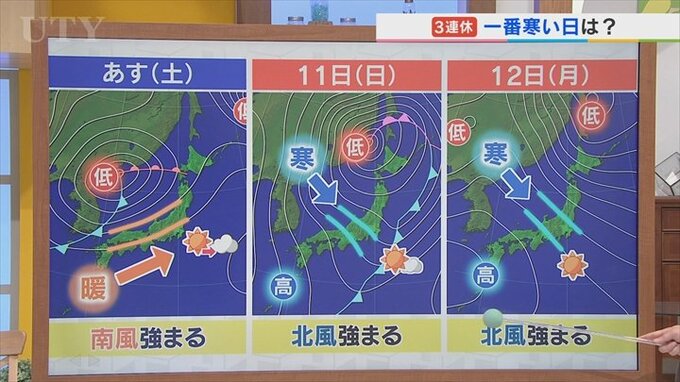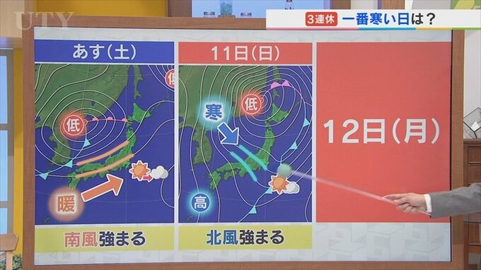 そして12日月曜日も同じように西に高気圧、東に低気圧の西高東低の気圧配置が続きましてやはり等圧線の間隔が狭くなりますから、北風が強い状況が続く見通しです。